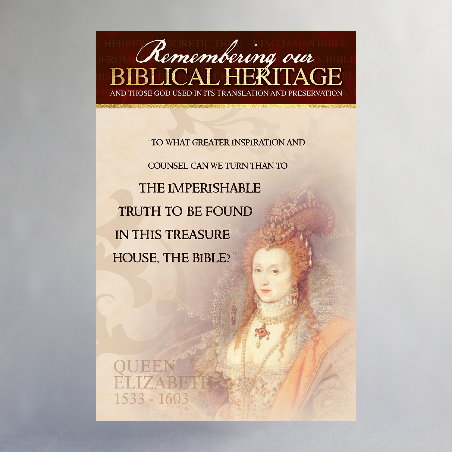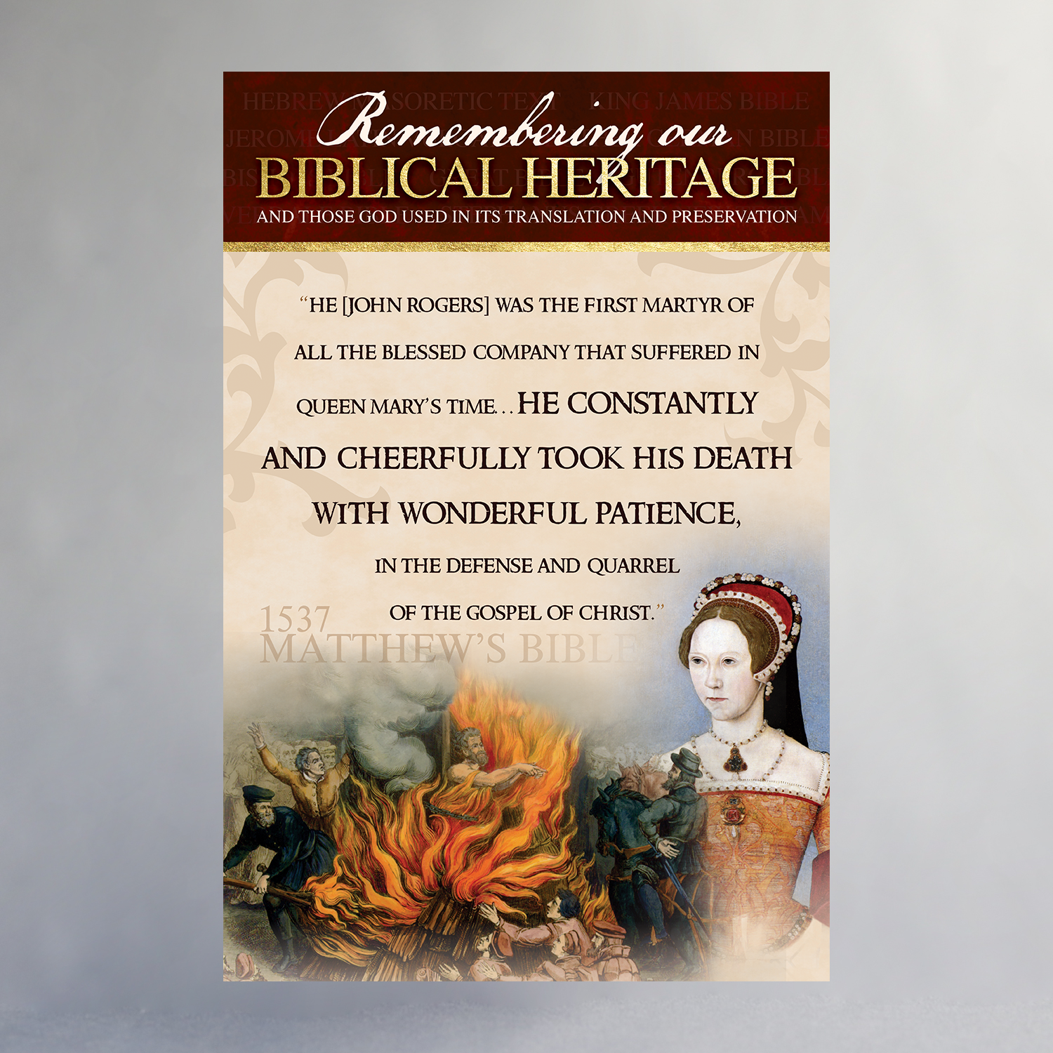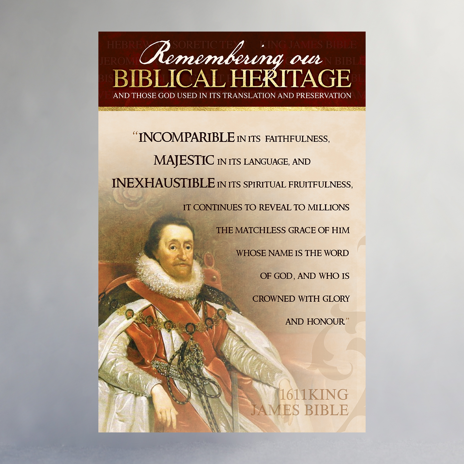 Created in celebration of the 400th Anniversary of the King James Bible, this poster series features many of the significant people, places, and printing processes that helped produce the English Bible. Available individually or as a set, only through the Biblical Heritage Exhibit.